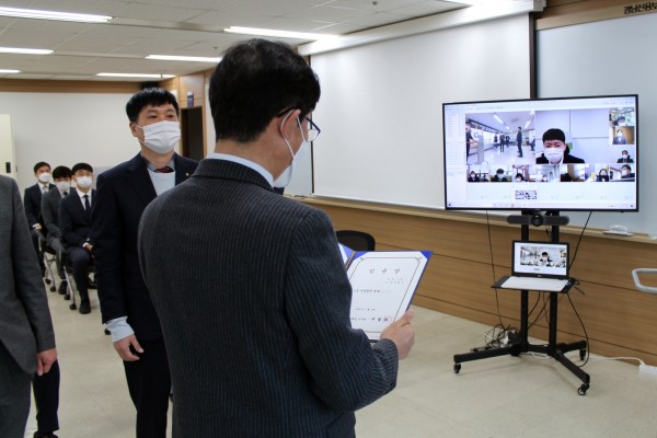 2021년 시무식 및 신입직원 임용식(2021.01.04) 페이지 정보 작성자 경남신용보증재단 댓글 0건 조회 279회 작성일 21-01-07 17:55 본문 □ 2021년 새해를 맞이하여 신입직원 임용식을 겸한 비대면 시무식을 개최하였다. 목록 이전글착한 선결제 캠페인 동참(2021.1.12) 21.01.12 다음글비대면 종무식 개최(2020.12.31) 20.12.31 댓글목록 댓글목록 등록된 댓글이 없습니다.