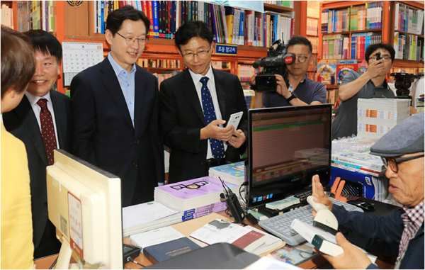 □ 구철회 이사장이 김경수 도지사, 김지수 도의회의장 등과 함께 팔용동 상가에서 경남사랑상품권 활성화를 위한 결재시연행사를 가졌다.