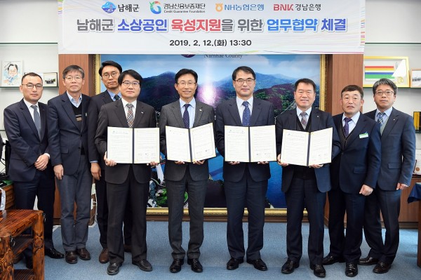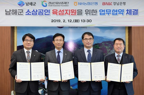 □ 남해군의 소상공인 육성자금 지원을 위해 남해군, 우리재단, 농협은행, 경남은행이 업무협약을 체결하였다.