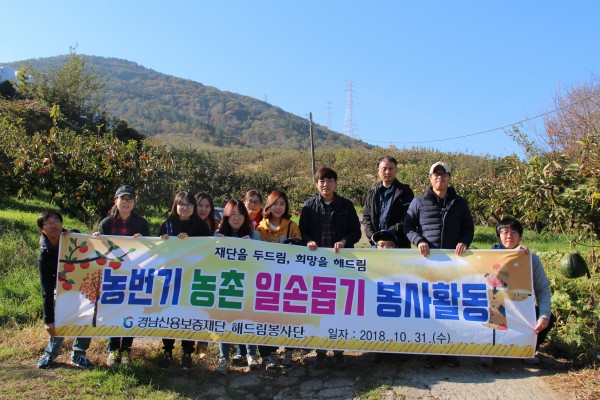 □ 2018년 10월 31일, 경남신보 본·지점 직원 13명은 농번기를 맞아 일손이 부족한 지역 농가 일손돕기를 통해 지역사회에 공헌하고자 지역의 한 단감농장에서 단감수확작업을 하였다.